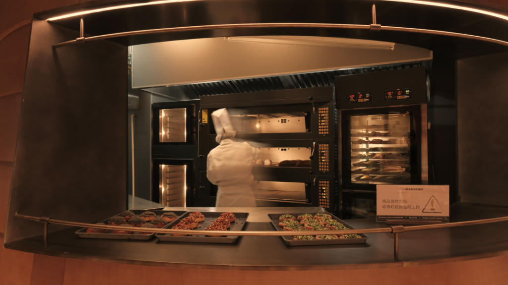 区别于传统预制品中央工厂,石头先生的烤炉在工厂端完成和面、分割以及采用18小时低温发酵工艺制成面团等工序,再通过自有冷链物流配送至全国门店,其中关键的烘烤、装饰等环节则全部在门店现场制作完成。